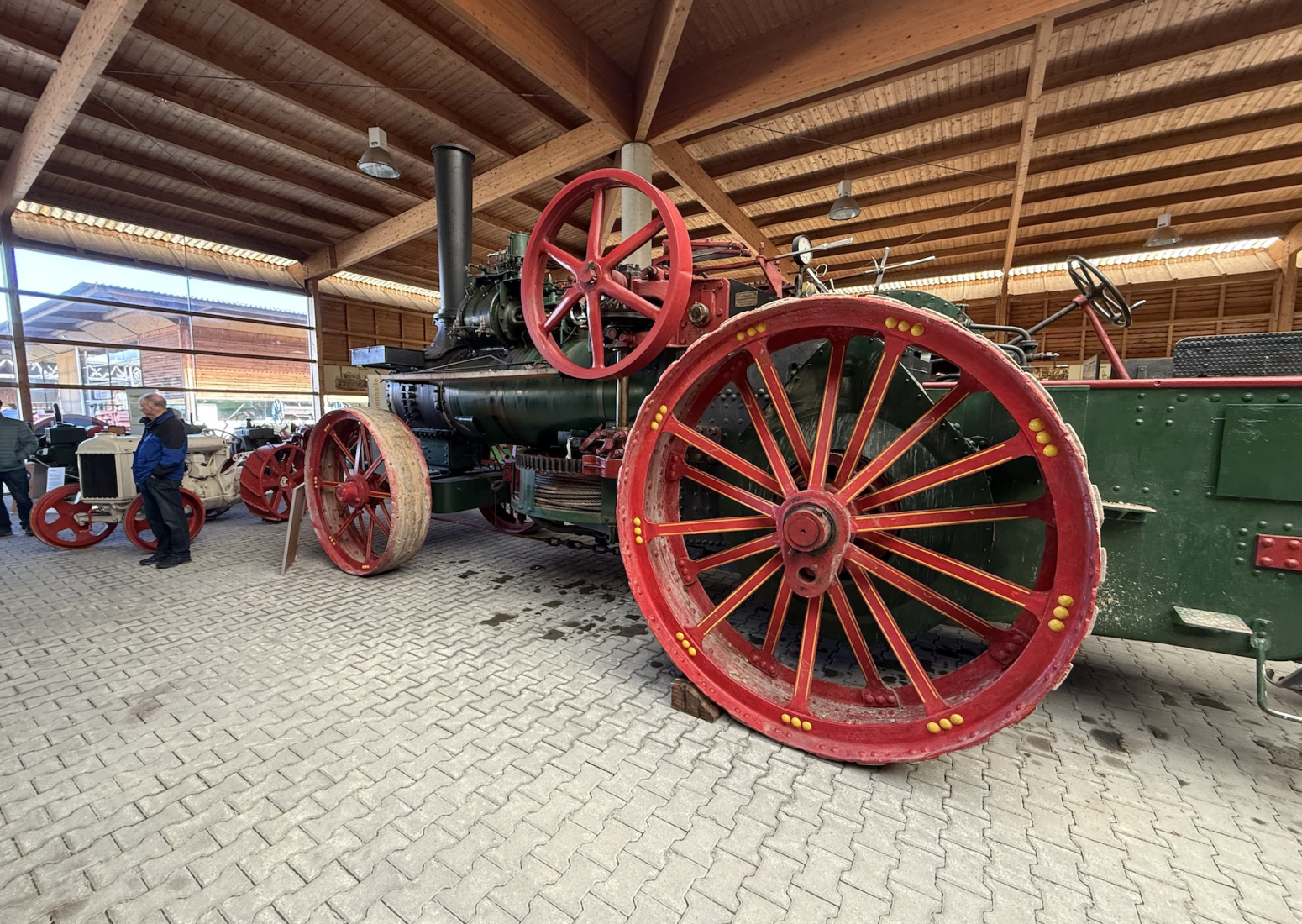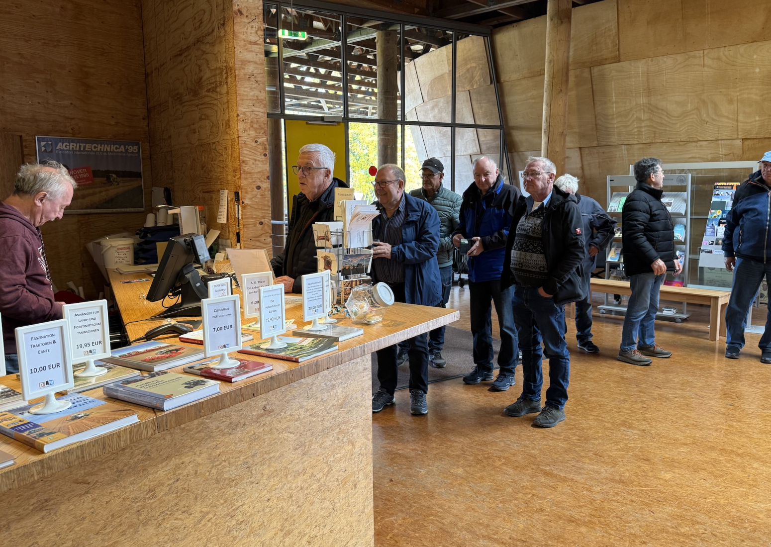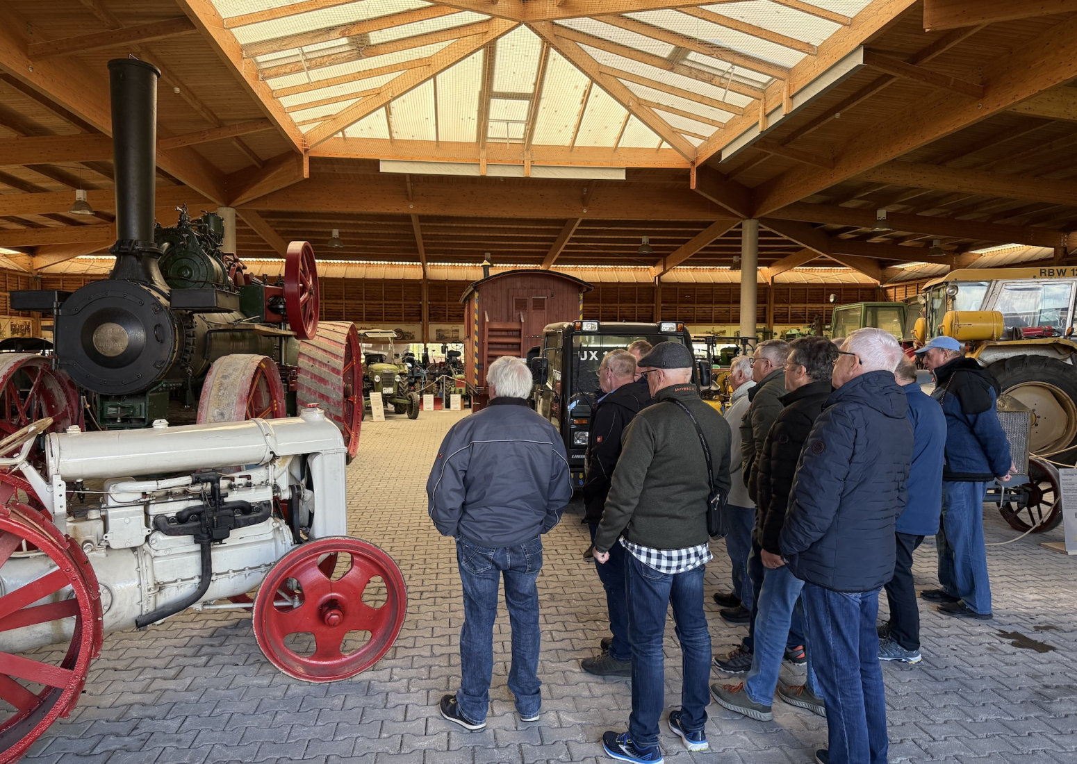 Unter fachkundiger Führung des Werkstattleiters erlebten wir eine Reise von der Vergangenheit in die Zukunft. Von der Sense zum Mähen des Getreides über diverse halbautomatische Mähgeräte bis hin zum vollautomatischen Mähdrehscher konnten wir viele verschiedene Exponate besichtigen. Auch in der Schlepper – Halle Nostalgie pur für unsere Mitglieder der Alterswehr. Einige davon sind als ehemalige Holder-Mitarbeiter „vom Fach“: