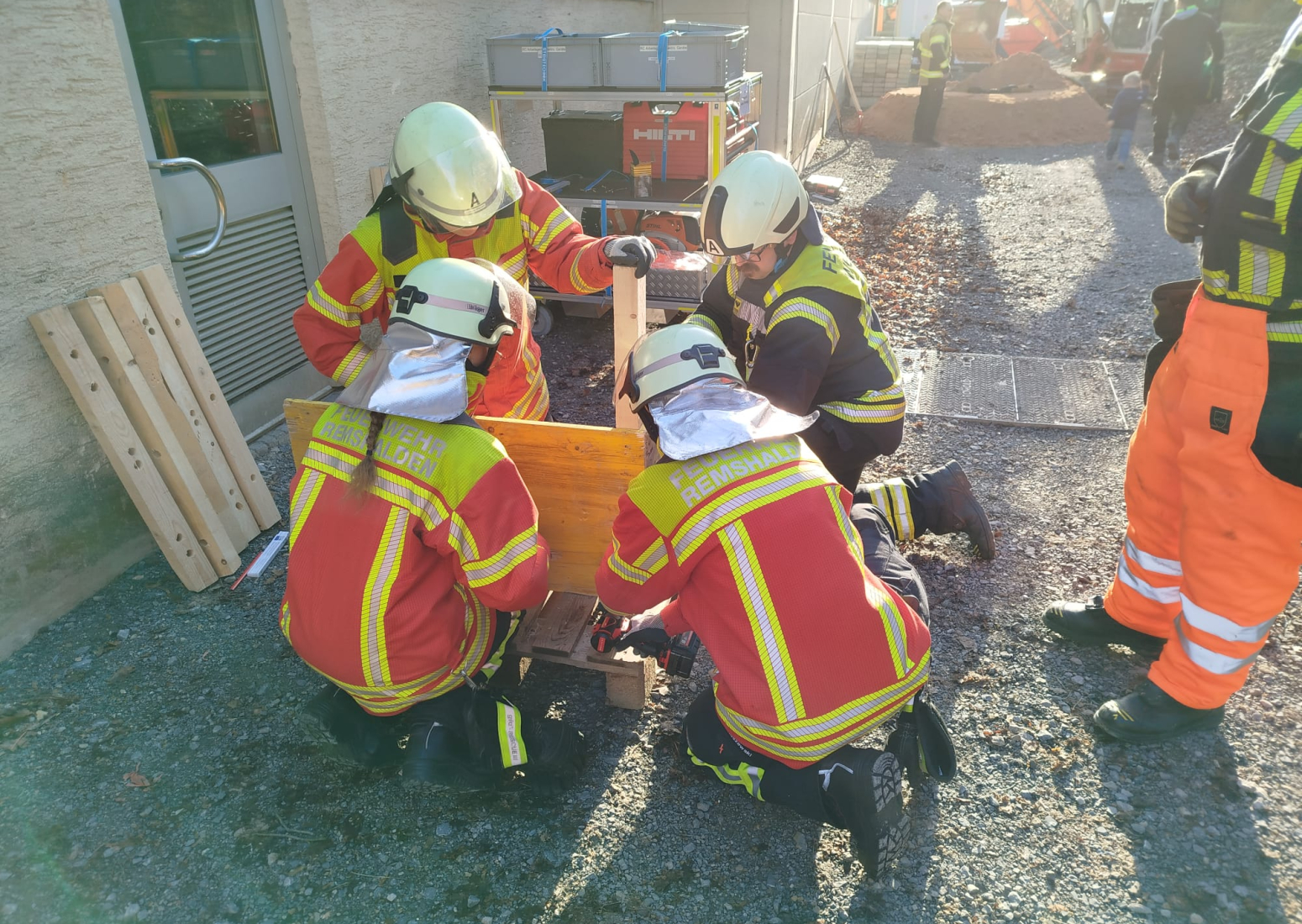 Bei unterschiedlichen Szenarien, darunter das Anheben von schweren Gegenständen, das Abstützen einsturzgefährdeten Gebäudeteile, sowie das Befreien von verschütteten Personen wurde das Vorgehen, das Abschätzen von Gefahren und die genaue Abstimmung gelehrt und geprüft.
