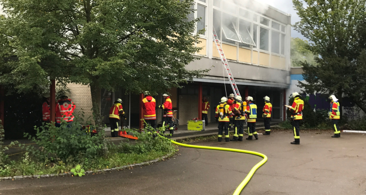 Feuer und Rauch dringen aus dem Fenster eines Klassenraumes. Mehrere Schüler mit verrußtem Gesicht und blutenden Wunden kommen den Einsatzkräften entgegen. Sie berichten, dass sich noch mehrere Personen im Gebäude aufhalten und der Brand sich immer mehr ausbreitet.