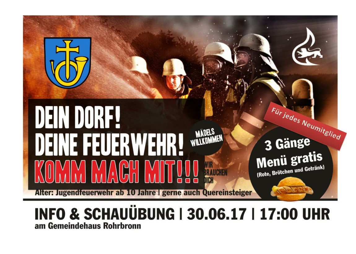 „Dein Dorf! Deine Feuerwehr! Komm mach mit!!!“ Mit diesem Aufruf lädt die Rohrbronner Feuerwehr zu einer großen Aktion am Freitag, 30. Juni, beim Gemeindehaus Rohrbronn ein.