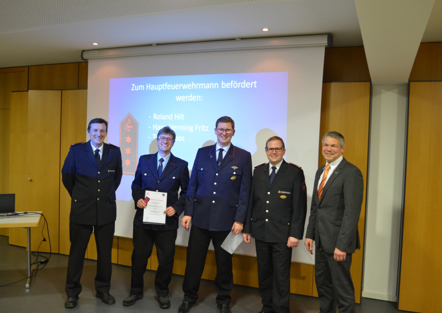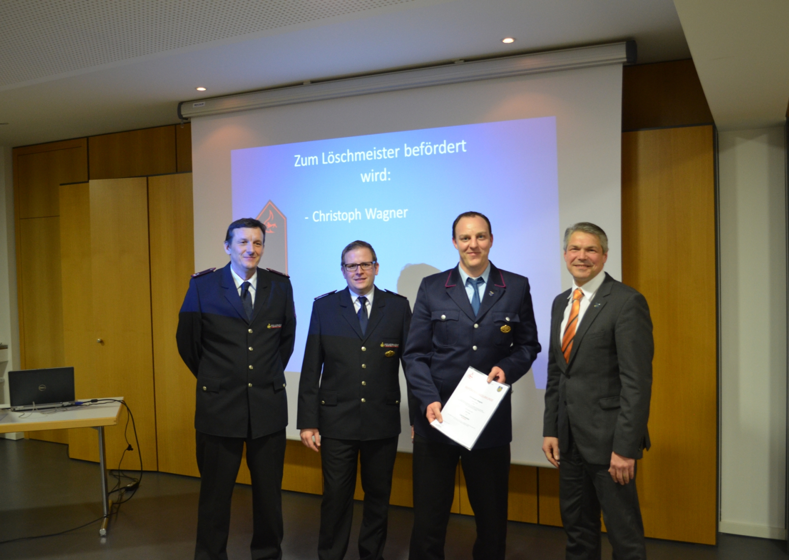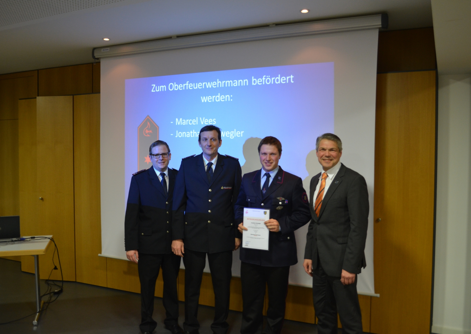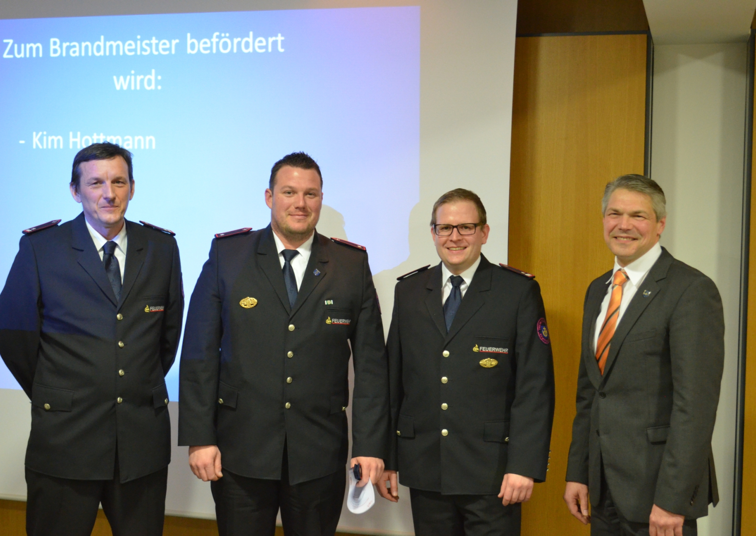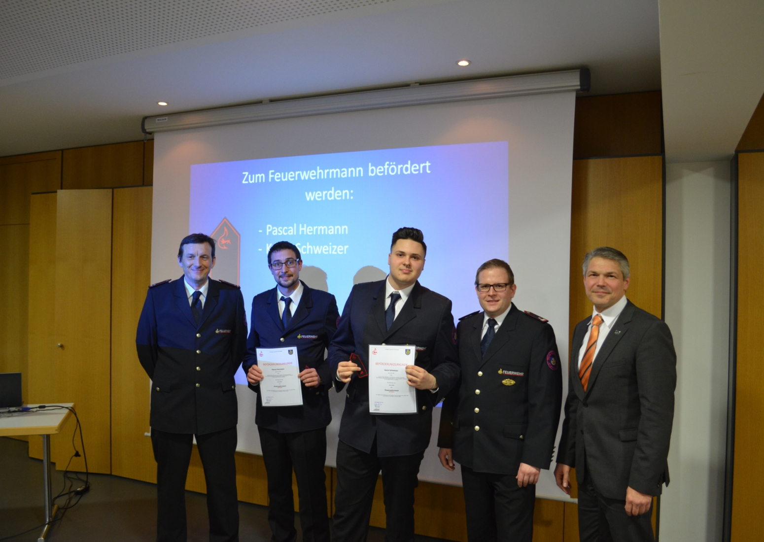 Auch einige Beförderungen standen auf der Tagesordnung. So wurden nach erfolgreich absolvierten Grundlehrgang Kevin Schweizer und Pascal Hermann zum Feuerwehrmann befördert. Die Ernennung zum Oberfeuerwehrmann erhielten Marcel Vees und Jonathan Schwegler. Die Urkunde zum Hauptlöschmeister bekamen Roland Hilt, Hans-Henning Fritz und Tobias Joos. Die Ausbildung zum Gruppenführer an der Landessfeuerwehrschule bestand Christoph Wagner und ist ab sofort Löschmeister. Kim Hottmann wurde nach erfolgreichem Zugführerlehrgang zum Brandmeister befördert.
