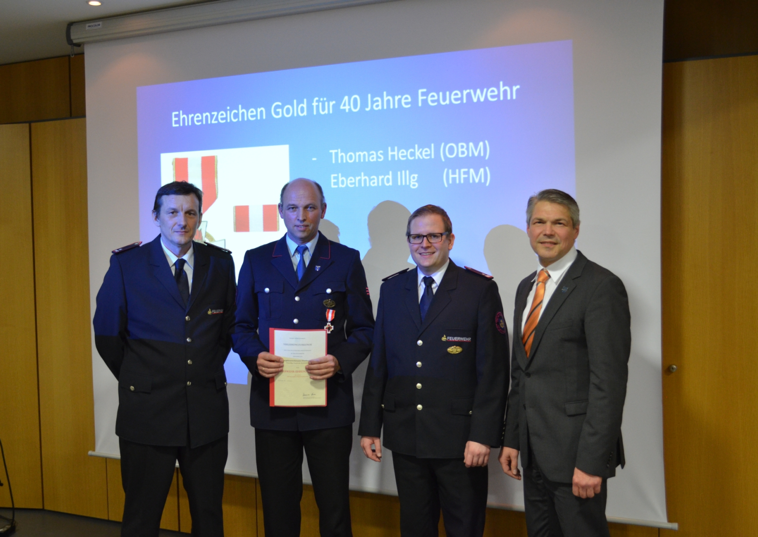 Dass die Feuerwehr auch nach 40 Jahren noch Interessant ist zeigten wieder zwei Ehrungen. Thomas Heckel und Eberhard Illg erhielten für 40-jährige Feuerwehrzugehörigkeit das goldene Ehrenzeichen des Landes Baden-Württembergs. Für seine besonderen Dienste wurde Bernd Maier mit dem bronzenen Ehrenzeichen des Kreisfeuerwehrverbandes ausgezeichnet.