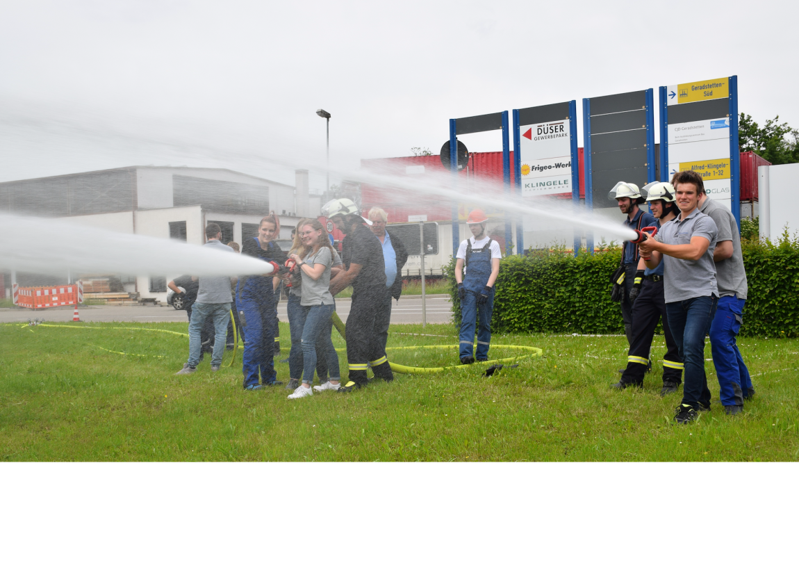 Bei ein paar andere Feuerwehrmitglieder beschäftigten sich die Auszubildenden mit dem Aufgabenbereich Löschen. Hierbei wurde ihnen ein Feuerwehrauto, die verschiedenen Schläuche und verschiedenen Strahlrohre mit denen man einen Löschangriff aufbauen kann vorgestellt. Anschließend durfte jeder selber ans Strahlrohr und die verschiedenen Schläuche und Einstellungen eines Strahlrohrs ausprobieren.