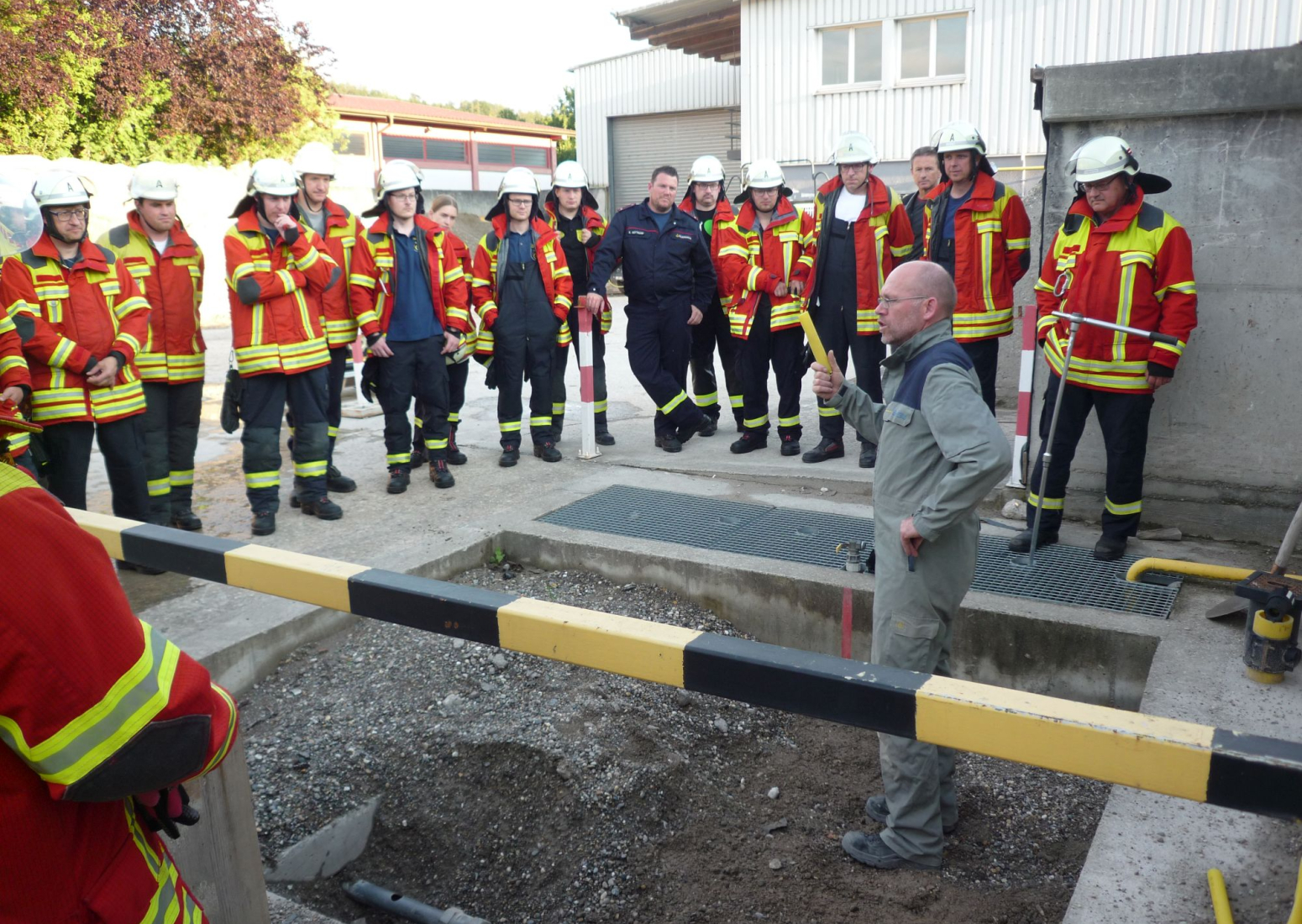 Ein Referent von der Netze BW, dem Betreiber der Gasleitung, erklärte zunächst in einem Theorieblock den Aufbau des Leitungsnetzes, das Drucksystem, sowie Abstellmöglichkeiten bei einem Störfall. Bevor es anschließend an die Praxis ging. An einer landesweit einzigartigen Demonstrationsanlage auf dem Gelände des Ausbildungszentrums Bau in Geradstetten konnten die Feuerwehrangehörigen hautnah erleben, was passiert wenn Erdgas aus einer beschädigten Leitung austritt. Aber nicht nur die Kräfte und die gewaltige Geräuschentwicklung die sich bei einer unkontrollierten Ausströmung entwickeln beeindruckten. Sondern auch die Stichflamme die durch Zuführung einer Zündquelle entsteht. Dabei reicht oftmals ein elektrischer Funke. Nach den verschiedenen Vorführungen durften die Übungsteilnehmer selbst ran. Mit Hilfe von mitgeführten Gerätschaften auf dem Einsatzfahrzeug musste weiteres Ausströmen verhindert werden. So drückten sie zum Beispiel mit dem Spreizer die Gasleitung ab.