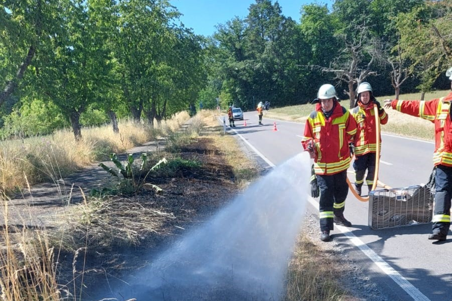 Eine Wiese am Fahrbahnrand hatte Feuer gefangen. Die ersten Kräfte vor Ort, löschten den Brand mit einem C-Rohr ab.